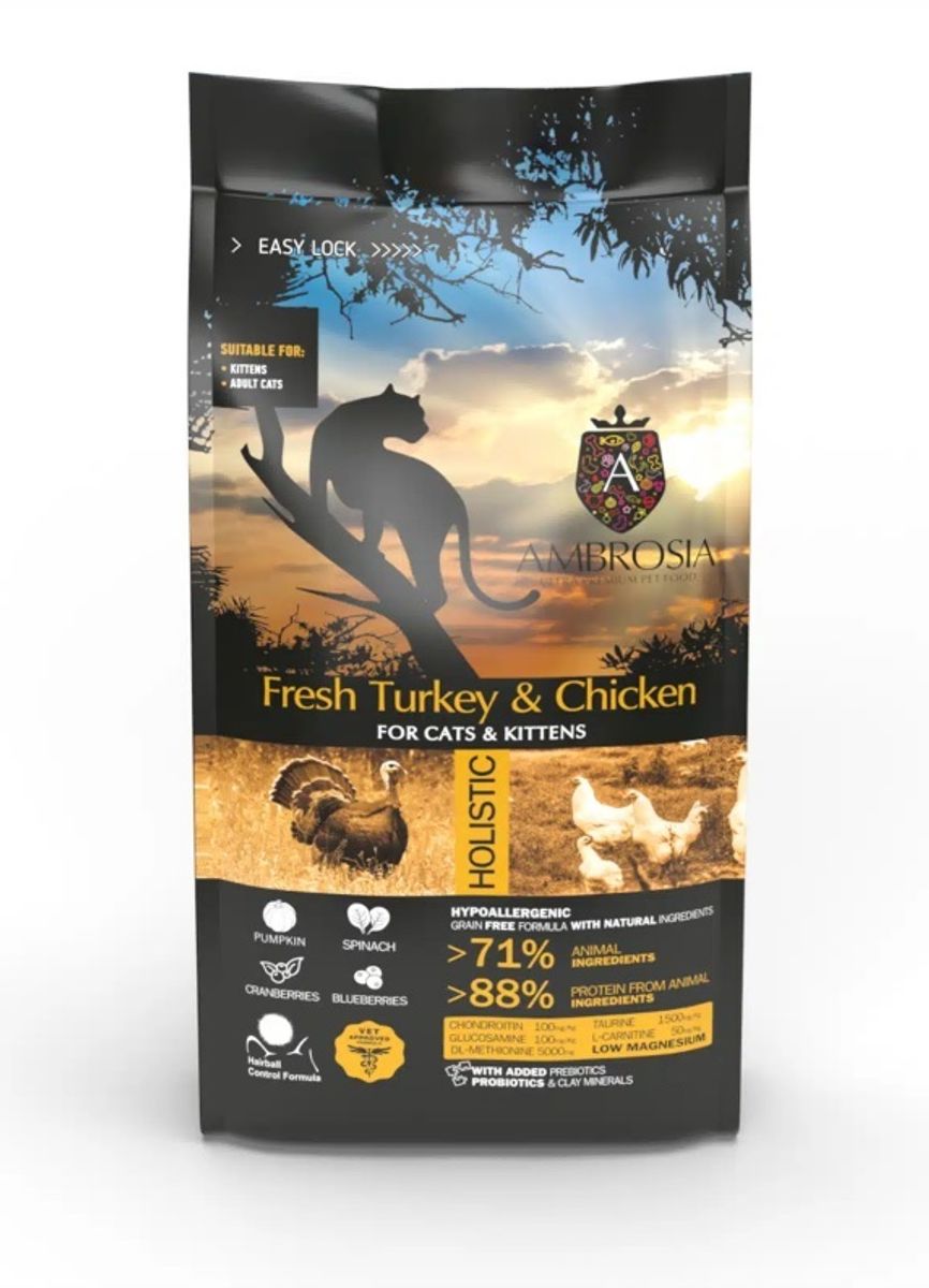 אמברוסיה הודו ועוף לחתול גור וחתול בוגר ללא דגנים, Ambrosia Ultra Premium Turkey and Chicken for Cats and Kittens Grain-Free. מזון יבש מלא ללא דגנים ברמת אולטרה פרמיום לחתולים גורים וגם חתולים בוגרים. היפואלרגני ומתאים לחתולים בעלי רגישויות. מכיל את מכלול הרכיבים התזונתיים אשר גורים זקוקים להם כדי לגדול ולהתפתח בצורה אופטימלית, ויחד עם זאת בעל ערך קלורי אשר אינו גבוה מדיי ומתאים גם לחתולים בוגרים. אמברוסיה מזון יבש הודו ועוף לגורי חתולים ובוגרים משלב פילה הודו טרי ובשר עוף מיובש בעל ערך חלבוני גבוה יחד עם פירות וירקות נבחרים, התורמים לפעולת עיכול מיטבית ובריאה. כמו כן, מזון אמברוסיה לחתול מכיל תוספת פרה-ביוטיקה ופרוביוטיקה הנחוצים למערכת עיכול ומערכת חיסונית בריאות. מכיל כונדרויטין וגלוקוזאמין להגנה ושמירה על מפרקים בריאים, ו-L קרניטין להתפתחות ותפקוד בריאים של המח והלב. אמברוזיה גורים הודו ועוף אולטרה פרימיום לחתולים מבוסס על נוסחה מאוזנת המספקת את היסודות התזונתיים הדרושים לחתולים לשמירה על גוף בריא ואיכות חיים טובה.